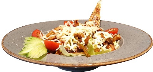 Tortilla kasesi için de Izgara tavuk fleto dilimleri,mısır,meksika fasulyesi,köz kırmızı biber,çeri domates,salatalık ve chefin özel sosu ile…
