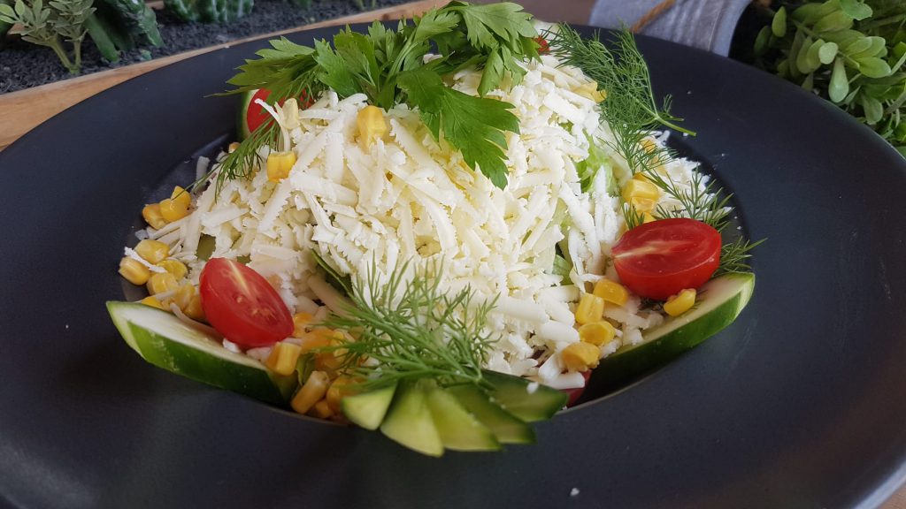 Atom, roka, maydanoz, dereotu, rende beyaz peynir, tane mısır.