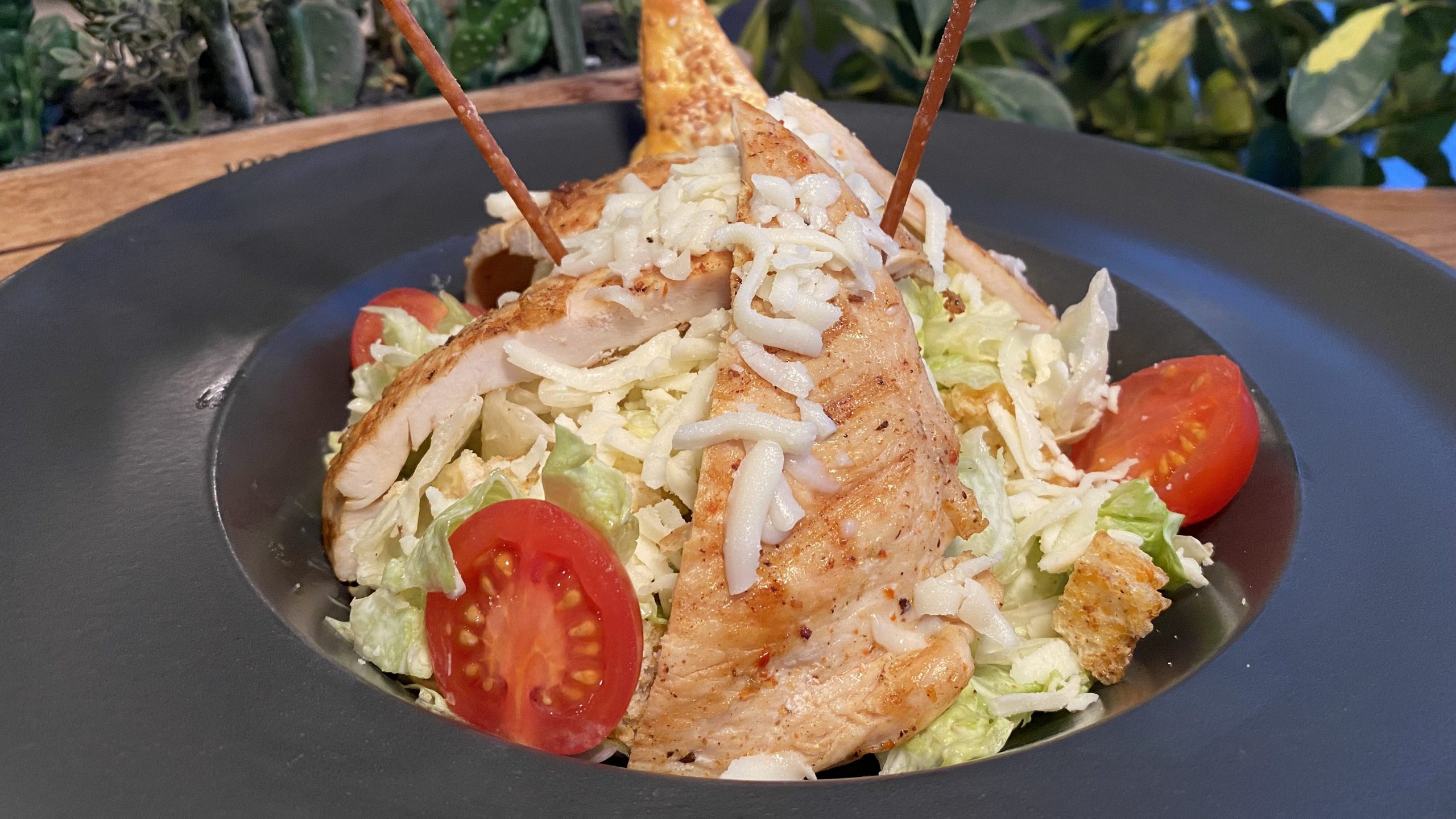 Izgara piliç fileto, mevsim yeşillikleri, çeri domates, kaşar peyniri, kruton ekmek, sezar sos.